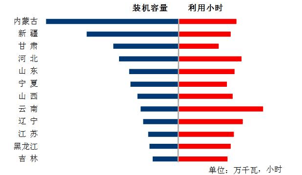 圖6  1-7月份風(fēng)電裝機(jī)較多省份風(fēng)電裝機(jī)容量和設(shè)備利用小時(shí)