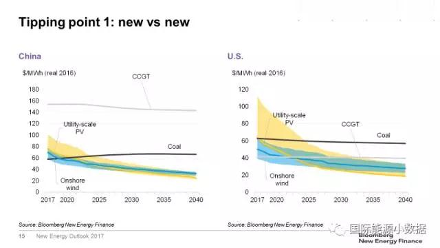 第一個(gè)臨界點(diǎn)是:在沒有補(bǔ)貼的情況下,新建風(fēng)電、光伏電站發(fā)電成本可與新建煤電、天然氣電站競(jìng)爭(zhēng)。在目前的市場(chǎng)條件下,在很多國(guó)家已經(jīng)接近這一臨界點(diǎn)。在德國(guó),新建陸上風(fēng)電的發(fā)電成本已經(jīng)低于煤電、天然氣發(fā)電;在中國(guó),目前煤電成本在各類電源中依然是最低的,但是預(yù)期2019年陸上風(fēng)電成本將低于煤電、2021年光伏成本也將低于煤電;在美國(guó),天然氣發(fā)電是各類電源中成本最低的,但預(yù)計(jì)2022-2023年風(fēng)電、光伏成本均將低于天然氣發(fā)電;在印度,預(yù)計(jì)2020年起新建光伏將在全國(guó)范圍內(nèi)低于煤電。
