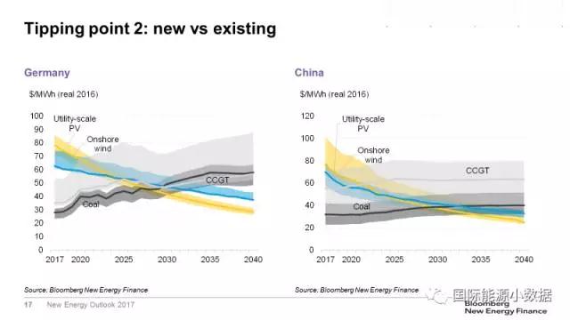 第二個(gè)臨界點(diǎn)是:新建的風(fēng)電、光伏電站的發(fā)電成本低于現(xiàn)有煤電、天然氣電站的運(yùn)行成本。這個(gè)臨界點(diǎn)將比人們想象的更快到來。在中國(guó),預(yù)計(jì)2030年光伏成本將低于已有的煤電運(yùn)行成本;在美國(guó),光伏成本將從2027年起低于已有天然氣發(fā)電廠的運(yùn)行成本;在德國(guó),陸上風(fēng)電、光伏成本將在2027-2030年之間低于煤電、天然氣發(fā)電廠的運(yùn)行成本。