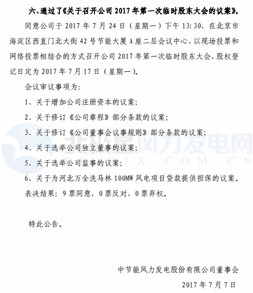 中節(jié)能風(fēng)力發(fā)電股份有限公司第三屆董事會第十一次會議于2017年7月6日召開,會議審議通過了《關(guān)于增加公司注冊資本的議案》、《關(guān)于提名公司獨(dú)立董事候選人的議案》、《關(guān)于投資建設(shè)洗馬林100MW風(fēng)電場項(xiàng)目的議案》等事項(xiàng)。其中,公司注冊資本由原來20億元變更為42億元;提名秦海巖、姜軍為公司獨(dú)董候選人;同意投資建設(shè)河北萬全洗馬林100MW 風(fēng)電場項(xiàng)目,項(xiàng)目總投資為 80,528 萬元。以下是公告原文: