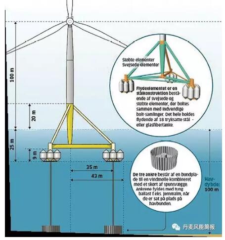 2014年Henrik Stiesdal從西門(mén)子風(fēng)電首席技術(shù)官的位置退休后,創(chuàng)立了自己的公司Stiesdal A/S,并設(shè)計(jì)了新一代漂浮式海上風(fēng)機(jī)基礎(chǔ)。Henrik Stiesdal發(fā)明的下一代漂浮式基礎(chǔ)如下圖。在2016年10月美國(guó)海上風(fēng)電大會(huì)上,Henrik Stiesdal作為演講人,展示過(guò)TetraSpar漂浮式海上風(fēng)機(jī)基礎(chǔ)的設(shè)計(jì)。而且,Henrik Stiesdal 并未對(duì)此漂浮式基礎(chǔ)設(shè)計(jì)申請(qǐng)專(zhuān)利保護(hù),任何人都可以嘗試在此基礎(chǔ)上進(jìn)行設(shè)計(jì)改進(jìn)。