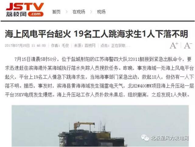 7月14日凌晨6時許,江蘇省濱??h濱海北區(qū)H2#400MW海上風(fēng)電場發(fā)生一起電纜爆燃事故,平臺上19人跳海求生。截止15日中午,18人生還,1人失聯(lián)。至今尚無進一步消息。