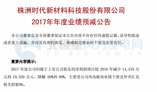 時代新材預(yù)計2017 年實現(xiàn)歸屬于上市公司股東的凈利潤與上年同期相比,將減少1.45億元到1.94億元(14,519 萬元到 19,359 萬元,同比減少 60%到 80%。