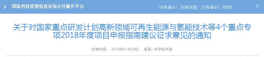 關(guān)于對(duì)國家重點(diǎn)研發(fā)計(jì)劃高新領(lǐng)域可再生能源與氫能技術(shù)等4個(gè)重點(diǎn)專項(xiàng)2018年度項(xiàng)目申報(bào)指南建議征求意見的通知