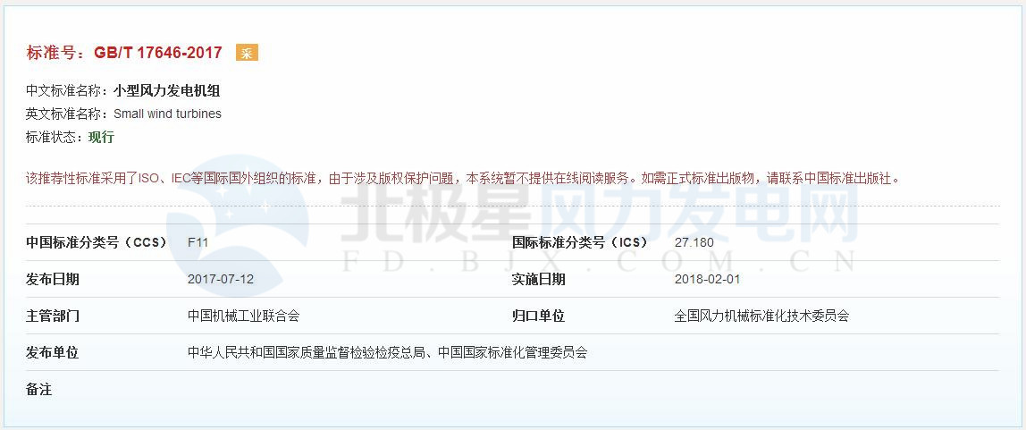 2018年2月1日起,《小型風力發(fā)電機組》、《風力發(fā)電機組驗收規(guī)范》2項風電標準現(xiàn)已施行。以下為具體標準內(nèi)容: