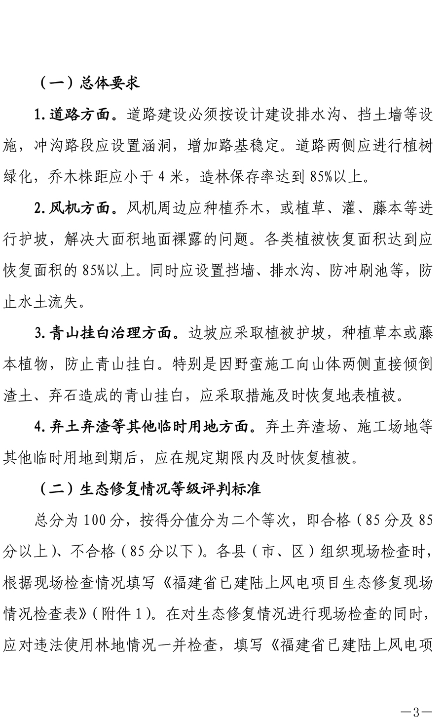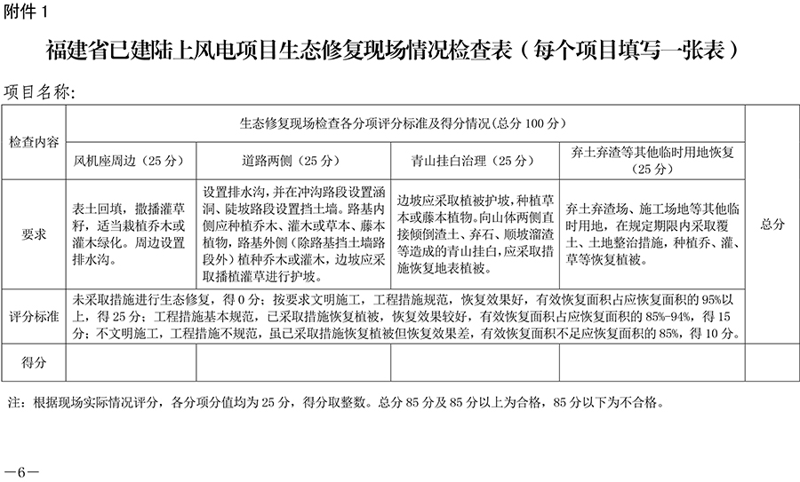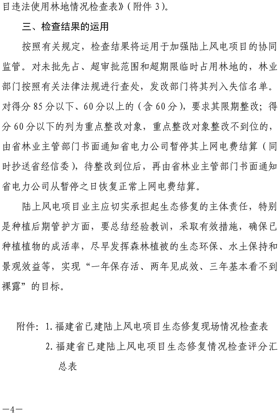 專項(xiàng)檢查重點(diǎn)針對(duì)項(xiàng)目道路建設(shè)、風(fēng)機(jī)周邊防護(hù)、青山掛白治理、棄土棄渣等臨時(shí)用地植被恢復(fù)情況,對(duì)生態(tài)修復(fù)等級(jí)評(píng)判分為合格、不合格二個(gè)等次。針對(duì)專項(xiàng)檢查結(jié)果,對(duì)違法違規(guī)使用林地的風(fēng)電企業(yè),林業(yè)部門(mén)將按有關(guān)法律法規(guī)查處,發(fā)改部門(mén)將其列入失信名單。對(duì)生態(tài)修復(fù)工作不達(dá)標(biāo)、效果差的,要求限期整改,對(duì)整改仍不到位的,暫停其上網(wǎng)電費(fèi)結(jié)算。