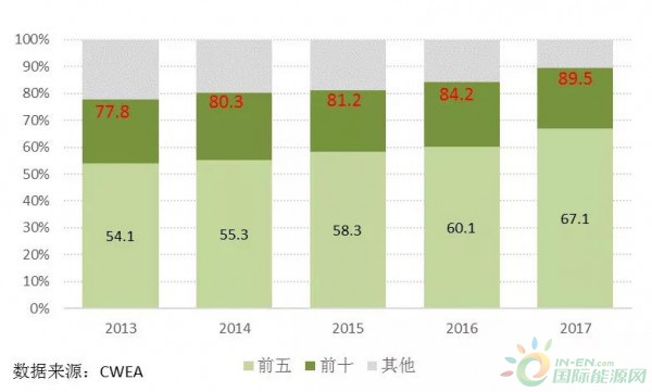 近5年,風(fēng)電整機(jī)制造企業(yè)的市場份額集中趨勢明顯。排名前五的風(fēng)電機(jī)組制造企業(yè)新增裝機(jī)市場份額由2013年的54.1%增長到2017年的67.1%,增長了13%;排名前十的風(fēng)電制造企業(yè)新增裝機(jī)市場份額由2013年的77.8%增長到2017年的77.8%增長到2017年的89.5%,增長了12%。