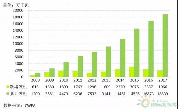 圖1  2008年至2017年中國新增和累計風(fēng)電裝機(jī)容量