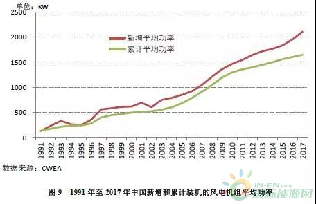 2017年,中國新增裝機(jī)的風(fēng)電機(jī)組平均功率2.1MW,同比增長8%;截至2017年底,累計裝機(jī)的風(fēng)電機(jī)組平均功率為1.7MW,同比增長2.6%。