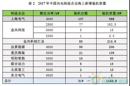 2017年,中國海上風(fēng)電取得突破進(jìn)展,新增裝機(jī)共319臺,新增裝機(jī)容量達(dá)到116萬千瓦,同比增長97%;累計裝機(jī)達(dá)到279萬千瓦。2017年共有8家制造企業(yè)有新增裝機(jī),其中,上海電氣新增裝機(jī)容量最多,共吊裝147臺,容量為58.8萬千瓦,占比達(dá)到50.5%。