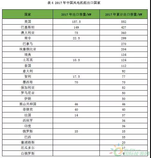 2017年,中國向國外出口風(fēng)電機(jī)組311臺,容量641MW,同比增長21%。截至2017年底,中國風(fēng)電機(jī)組制造企業(yè)已出口的風(fēng)電機(jī)組共計1707臺,累計容量達(dá)到3205MW。