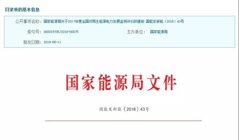 國家能源局發(fā)布了關(guān)于2017年度全國可再生能源電力發(fā)展監(jiān)測評價的通報。通報了全國可再生能源電力發(fā)展總體情況,各省(區(qū)、市)可再生能源電力