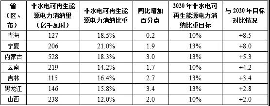 寧夏。2017年,全部可再生能源電力消納量有較大幅度提高,達(dá)到225億千瓦時,占本省全社會用電量的比重為23.0%,同比上升1.9個百分點;非水電可再生能源電力消納量為206億千瓦時,占本省全社會用電量的比重為21.0%,同比上升1.9個百分點。風(fēng)電和光伏發(fā)電均未達(dá)到最低保障收購年利用小時數(shù)要求,偏差分別為-200小時和-174小時。