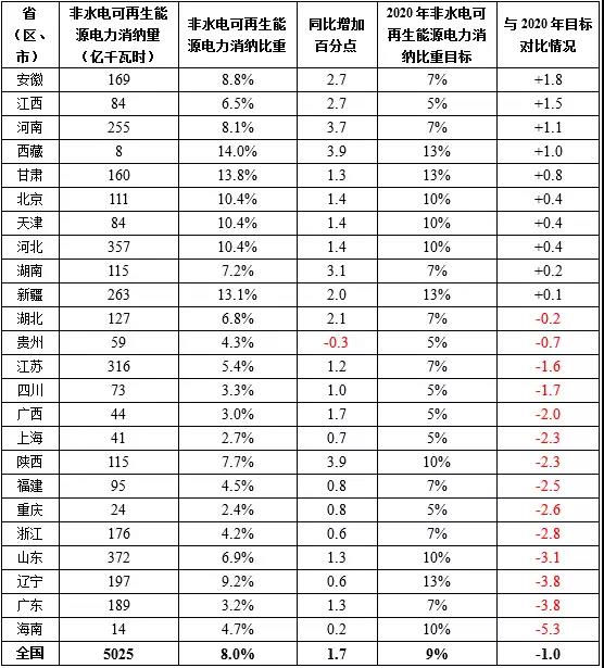 從非水電可再生能源消納比重來看,青海、寧夏、內(nèi)蒙古最高,均超過18%;從非水電可再生能源消納同比增長來看,西藏、陜西、河南三省(區(qū))同比增長較快,分別同比上升了3.9、3.9和3.7個百分點;從完成2020年非水電可再生能源電力消納比重目標(biāo)情況來看,寧夏、青海、內(nèi)蒙古等17個省(區(qū)、市)非水電可再生能源消納比重已達(dá)到2020年目標(biāo),湖北、貴州、江蘇、陜西達(dá)到2020年目標(biāo)的75%以上,廣東、海南、重慶低于2020年目標(biāo)的50%。
