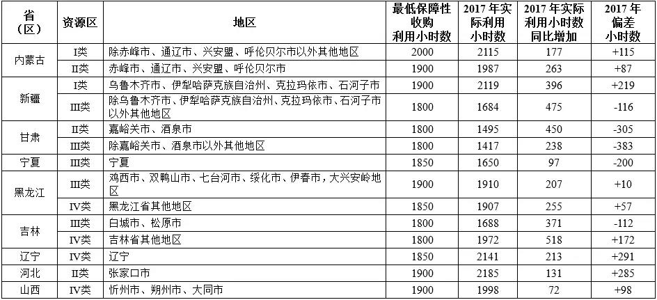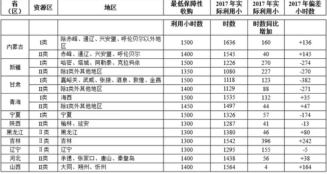 表3 2017年風(fēng)電重點地區(qū)最低保障收購年利用小時數(shù)落實情況