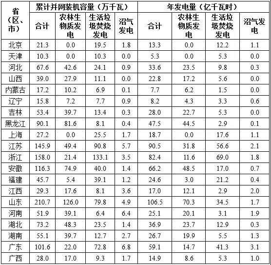 截至2017年底,全國共有30個省(區(qū)、市)投產(chǎn)了747個生物質(zhì)發(fā)電項目,并網(wǎng)裝機容量1476.2萬千瓦(不含自備電廠),年發(fā)電量794.5億千瓦時。其中農(nóng)林生物質(zhì)發(fā)電項目271個,累計并網(wǎng)裝機700.9萬千瓦,年發(fā)電量397.3億千瓦時;生活垃圾焚燒發(fā)電項目339個,累計并網(wǎng)裝機725.3萬千瓦,年發(fā)電量375.2億千瓦時;沼氣發(fā)電項目137個,累計并網(wǎng)裝機50.0萬千瓦,年發(fā)電量22.0億千瓦時。生物質(zhì)發(fā)電累計并網(wǎng)裝機排名前四位的省份是山東、浙江、江蘇和安徽,分別為210.7萬、158.0萬、145.9萬和116.3萬千瓦;年發(fā)電量排名前四位的省份是山東、江蘇、浙江和安徽,分別是106.5億、90.5億、82.4億和66.2億千瓦時。2017年各省(區(qū)、市)各類生物質(zhì)發(fā)電并網(wǎng)裝機及發(fā)電量如下: