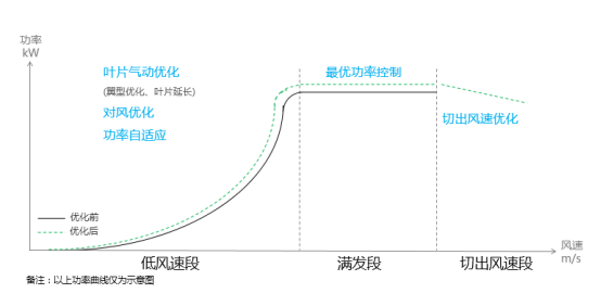 功率曲線全周期最優(yōu),挖掘最大發(fā)電潛能。圖為金風(fēng)風(fēng)電場發(fā)電量提升解決方案及其在功率曲線的不同階段對發(fā)電量的影響
