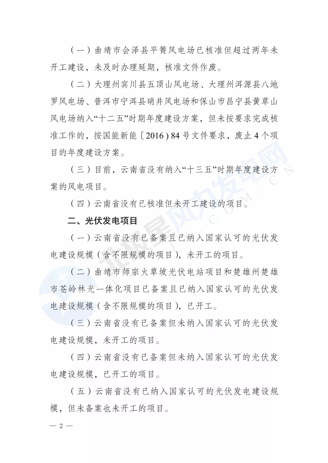據(jù)《云南省能源局關于公示“十二五”以來 云南省風電和光伏發(fā)電項目 有關情況的通知》,曲靖市會澤縣平箐風電場(48MW)已核準但超過兩年未開工建設,未及時辦理延期,核準文件作廢。 大理州賓川縣五頂山風電場(49.5)、大理州洱源縣八地 羅風電場(49.5)、普洱市寧洱縣硝井風電場(50)和保山市昌寧縣黃草山風電場(50)納入“十二五”時期年度建設方案,但未按要求完成核 準工作的,按國能新能〔2016 ) 84 號文件要求,廢止 4個項目的年度建設方案。