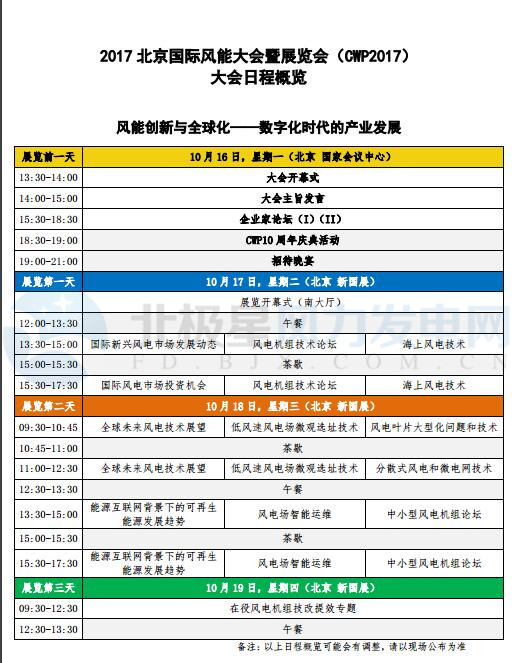 一年一度的風(fēng)電行業(yè)最大盛會(huì)——2017北京國(guó)際風(fēng)能大會(huì)暨展覽會(huì)(CWP2017)即將來(lái)臨。本次盛會(huì)將于10月17-19日在新國(guó)展舉行。以下為具體大會(huì)日程: