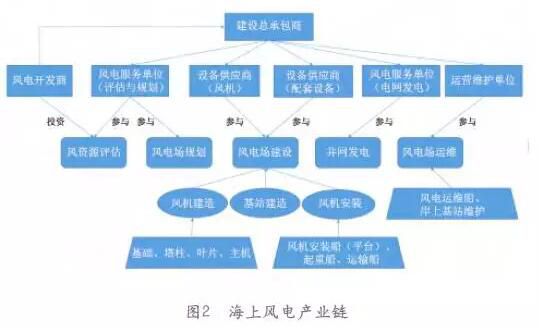 海上風能利用的不斷增加也必將帶動產業(yè)鏈內的各相關行業(yè)發(fā)展。海上風電產業(yè)的運行,以海上風電投資企業(yè)為主導和驅動力,其總投資量在很大程度上決定了風電項目的規(guī)模和相關企業(yè)的獲利大??;以海上風電設備制造業(yè)為硬件供應,廣義上的風電設備供應應當包括風機整機供應和相關海上風電工程裝備供應。總體來說,海上風電產業(yè)鏈的運行主線為:風資源評估—風電場規(guī)劃—風電場建設—并網發(fā)電—風電場運維。