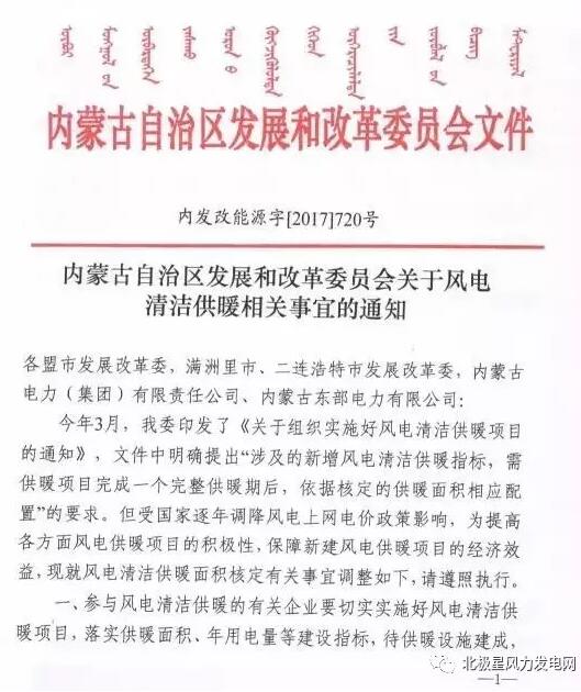 內(nèi)蒙古發(fā)改委近日發(fā)布了《關(guān)于風(fēng)電清潔供暖相關(guān)事宜的通知》。通知指出參與風(fēng)電清潔供暖的有關(guān)企業(yè)待供暖設(shè)施建成后,經(jīng)盟市發(fā)展改革委驗(yàn)收確認(rèn)具備供暖條件并核定供熱面積后,即可向當(dāng)?shù)匕l(fā)展改革委開展申請(qǐng)配置、核準(zhǔn)新建風(fēng)電項(xiàng)目指標(biāo)等工作。這一政策調(diào)整,就意味著目前建成及在建的風(fēng)電項(xiàng)目在供暖設(shè)施建成通過驗(yàn)收后,即可申請(qǐng)配置風(fēng)電指標(biāo),有望按照0.47元/千瓦時(shí)的上網(wǎng)電價(jià)執(zhí)行。以下為通知原文: