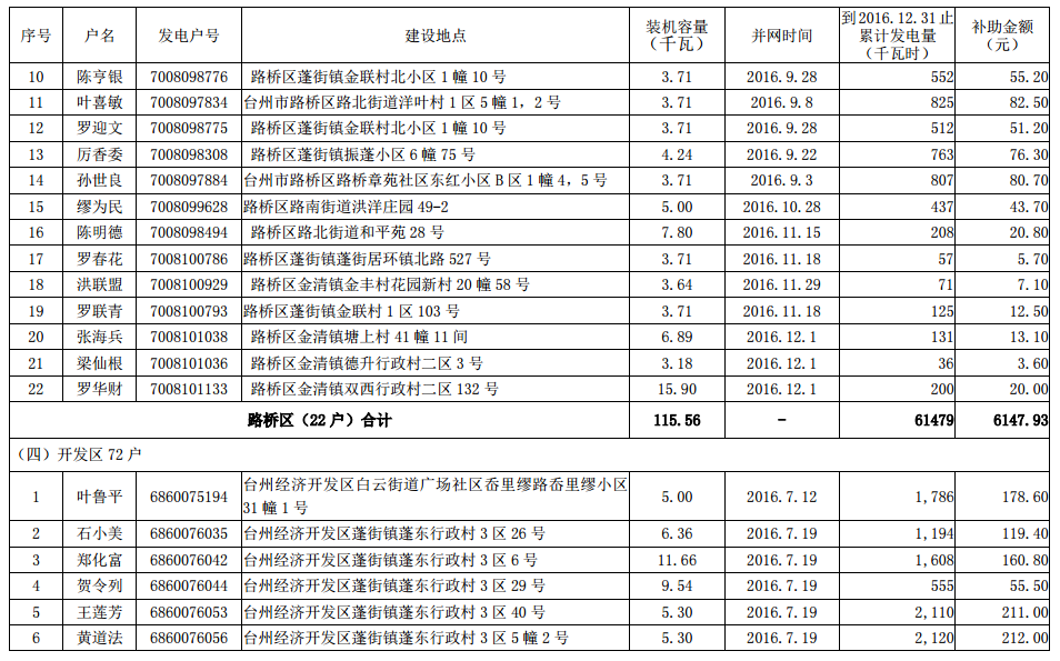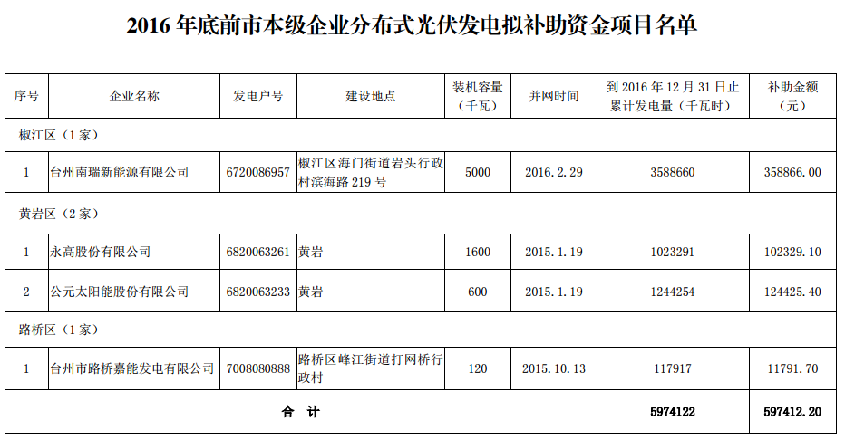 4家企業(yè) 235戶(hù)居民 2016年底前臺(tái)州市本級(jí)分布式光伏擬補(bǔ)助資金項(xiàng)目名單公示
