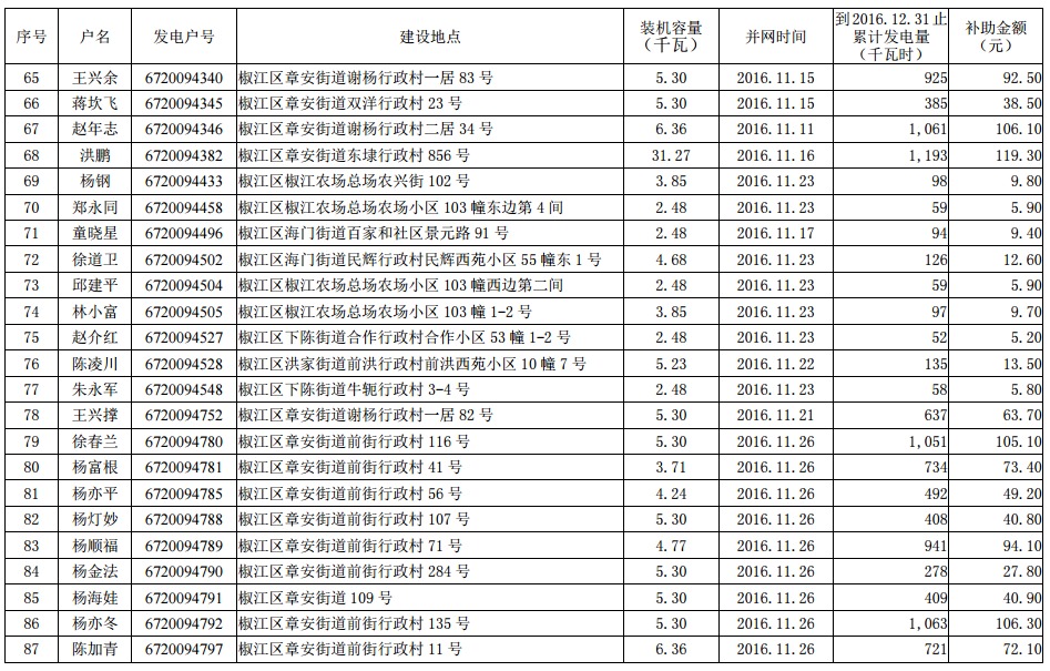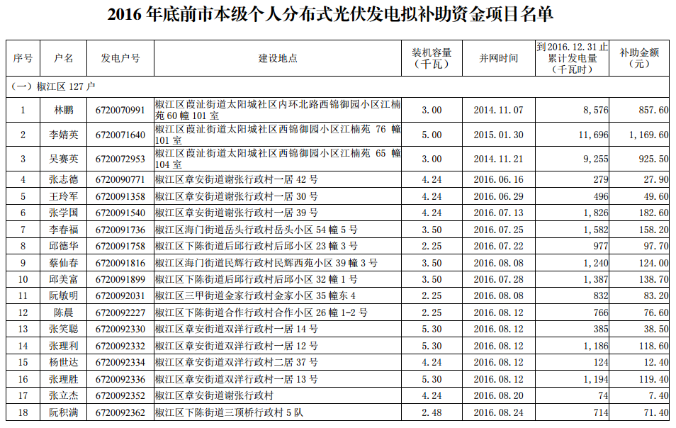 2016年底前市本級(jí)個(gè)人分布式光伏發(fā)電擬補(bǔ)助資金項(xiàng)目名單