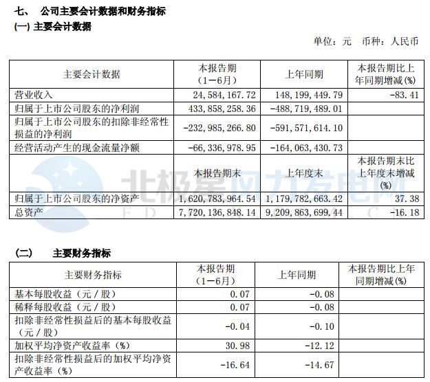1、 公司實現(xiàn)扭虧為盈報告期內,公司實現(xiàn)營業(yè)收入 24,584,167.72 元,實現(xiàn)歸屬于上市公司股東的凈利潤為 433,858,258.36 元,公司實現(xiàn)扭虧為盈,主要原因是本期有效控制費用開支、獲得供應商賠償收益、轉讓子公司等事項綜合影響;公司總資產(chǎn)為 7,720,136,848,14 元,歸屬于上市公司股東的凈資產(chǎn)為 1,620,783,964.54 元 。