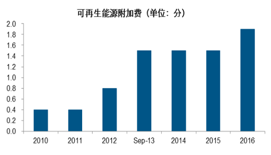 隨著可再生能源補(bǔ)貼資金需求的增加,我國(guó)分別于 2012、2013 和 2016 年三次上調(diào)除居民生活和農(nóng)業(yè)生產(chǎn)以外的其他用電的征收標(biāo)準(zhǔn),可再生能源附加費(fèi)從最初的 0.4 分/KWh 調(diào)整至 1.9 分/KWh。