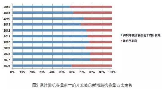上述變化趨勢(shì)與開發(fā)商數(shù)量波動(dòng)存在較大關(guān)聯(lián)。2006 年—2008 年,有新增裝機(jī)容量的開發(fā)商數(shù)量保持在30—40 家,2009 年—2012 年則增加至60—70 家。到2013 年—2014 年,這一數(shù)字進(jìn)一步提高到80—90 家。2014 年之后,有新增裝機(jī)容量的開發(fā)商猛增至120 家左右。從圖5 中可以看出,每當(dāng)開發(fā)商數(shù)量有較大幅度變動(dòng)時(shí),上述10 家企業(yè)的新增裝機(jī)容量占比就會(huì)出現(xiàn)大幅降低。這是因?yàn)?,開發(fā)商數(shù)量的增多,會(huì)在一定程度上“稀釋”裝機(jī)容量的分布,導(dǎo)致市場(chǎng)集中度的下降。這在2014 年—2015 年期間表現(xiàn)得最為明顯。