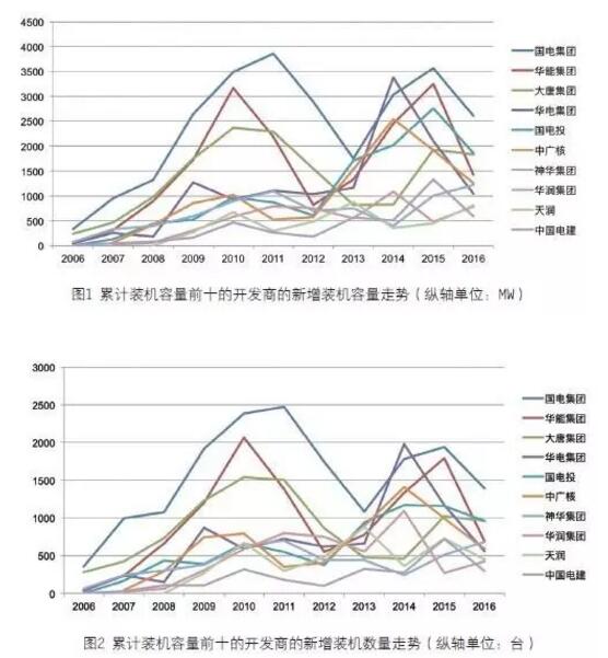 從圖3 和圖4 可以看出,在累計(jì)裝機(jī)容量上,國(guó)電集團(tuán)依然位居第一,與其他企業(yè)相比,仍具有較大的領(lǐng)先優(yōu)勢(shì)。并且在經(jīng)過2016 年的一年發(fā)展之后,這種優(yōu)勢(shì)還有進(jìn)一步擴(kuò)大的趨勢(shì)。
