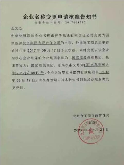 9月21日,北京市工商行政管理局正式下發(fā)核準(zhǔn)告知書:神華集團(tuán)有限責(zé)任公司于9月17日被核準(zhǔn)變更為國家能源投資集團(tuán)有限責(zé)任公司;核心企業(yè)組建的企業(yè)集團(tuán)名稱變更為國家能源投資集團(tuán);集團(tuán)簡稱為國家能源集團(tuán)。