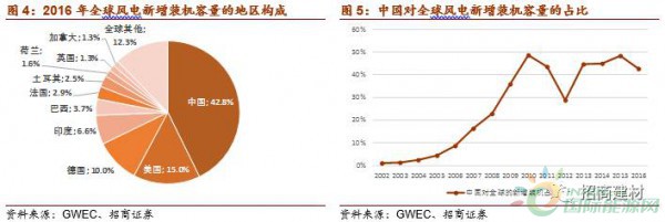 全球風(fēng)電新增裝機(jī)容量,2002-2009年經(jīng)歷了高速發(fā)展期,年均復(fù)合增速達(dá)到27%,2010-2016年,波動(dòng)較大,整體發(fā)展進(jìn)入平穩(wěn)期,年均復(fù)合增速為5%,但增量的絕對(duì)值較大。