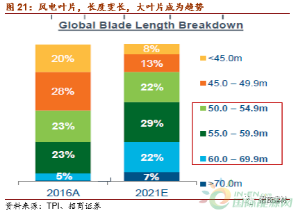 大葉片成為趨勢(shì)。全球的風(fēng)電葉片長(zhǎng)度,目前以45-59.9米為主導(dǎo),占比超過70%,預(yù)計(jì)未來,到2021年,60-69.9米的葉片占比將提升到20%。