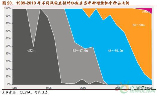 風(fēng)電機(jī)組風(fēng)輪直徑進(jìn)一步加大。對(duì)低風(fēng)速風(fēng)區(qū)開發(fā)的重視度增強(qiáng),降低單位成本,以及國(guó)內(nèi)風(fēng)電招投標(biāo)體制一般以千瓦功率為單位進(jìn)行價(jià)格的對(duì)比,風(fēng)電機(jī)組往大功率發(fā)展,風(fēng)輪直徑更大,葉片長(zhǎng)度更長(zhǎng)的產(chǎn)品更受市場(chǎng)歡迎。不同風(fēng)輪直徑的機(jī)組,2000年前后,以32-47.9米的為主導(dǎo);2005年前后,以48-59.9米的為主導(dǎo),而2010年后,60-90米的成為了主導(dǎo)。
