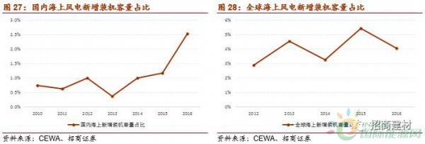 國(guó)內(nèi)海上風(fēng)電新增裝機(jī)容量的占比,從之前徘徊在1%左右,2016年快速提升到2.5%,進(jìn)入加速發(fā)展期。全球海上風(fēng)電同樣占比較低,處于加速發(fā)展的前期。