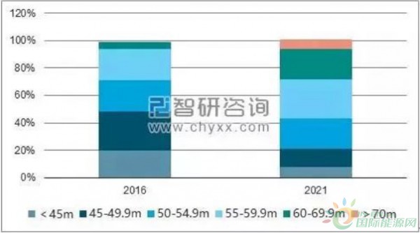 大葉片成為趨勢,全球的風(fēng)電葉片長度目前以 45-59.9 米為主導(dǎo),占比超過 70%,預(yù)計(jì)未來,到 2021 年,60-69.9 米的葉片占比將提升到 20%。