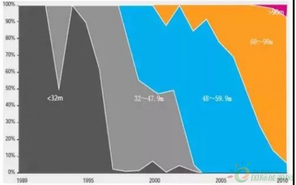 不同風(fēng)輪直徑的機(jī)組,2000 年前后,以 32-47.9 米的為主導(dǎo);2005 年前后,以 48-59.9 米的為主導(dǎo),而 2010 年后,60-90米的成為了主導(dǎo)。