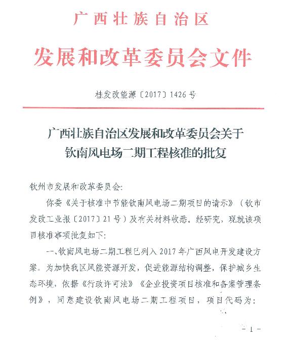 近日廣西壯族自治區(qū)發(fā)改委核準了欽南風電場二期工程,項目單位為中節(jié)能欽州風力發(fā)電有限公司,項目建設地點位于欽州市欽南區(qū),建設容量為80MW,總投資71123萬元。以下為批復原文: