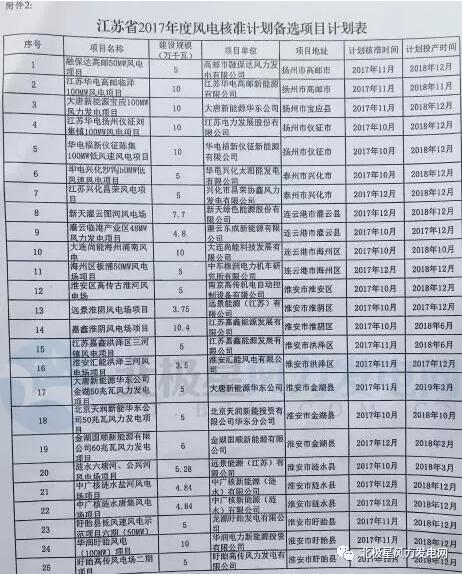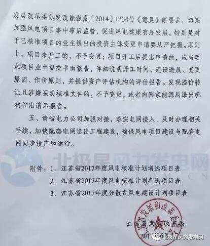 ​        中國(guó)風(fēng)能網(wǎng)訊:江蘇省發(fā)改委近日發(fā)布江蘇省2017年度風(fēng)電開(kāi)發(fā)建設(shè)方案,方案涉及45個(gè)項(xiàng)目共288.014萬(wàn)千瓦(其中備選項(xiàng)目31個(gè)203.91萬(wàn)千瓦,分散式風(fēng)電4個(gè)項(xiàng)目2.104萬(wàn)千瓦)。對(duì)于增選項(xiàng)目,各地最遲于2017年11月30日前上報(bào)核準(zhǔn);逾期未報(bào)或雖已上報(bào)但不具備核準(zhǔn)條件的,從增選項(xiàng)目中自動(dòng)調(diào)出。值得注意的是,本次江蘇發(fā)改委專門(mén)安排了2.104萬(wàn)千瓦的分散式風(fēng)電項(xiàng)目,最小的項(xiàng)目為0.004萬(wàn)千瓦。對(duì)于分散式風(fēng)電項(xiàng)目,由項(xiàng)目所在地設(shè)區(qū)市發(fā)展改革委按照分散式接入風(fēng)電的技術(shù)標(biāo)準(zhǔn)自行組織建設(shè)。以下為通知及建設(shè)方案: