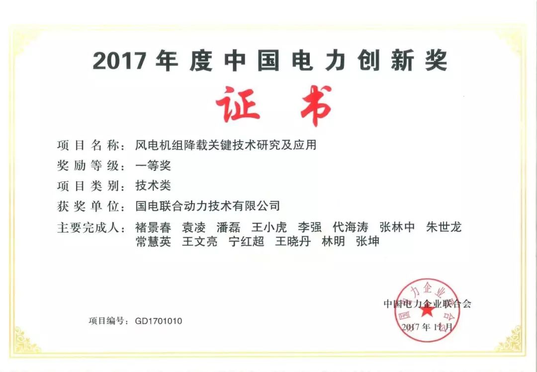 12月14日,在2017年度中國電力創(chuàng)新獎頒獎儀式上,聯(lián)合動力“風(fēng)電機(jī)組降載關(guān)鍵技術(shù)研究及應(yīng)用”項目被授予2017年度中國電力創(chuàng)新獎一等獎,這是聯(lián)合動力連續(xù)兩年獲此殊榮。