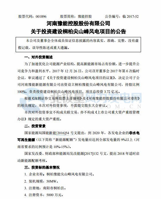 河南豫能控股股份有限公司12 月 26 日召開董事會 2017 年第 6 次臨時 會議,審議通過了《關(guān)于投資建設桐柏尖山峰風電項目的議案》,決定出資設立桐柏豫能尖山峰風電有限公司,持股比例 100%,投資建設桐柏尖山峰風電項目,該項目裝機規(guī)模50MW,注冊資本5000 萬元,項目總投資 達到3.72 億元。以下是會議原文: