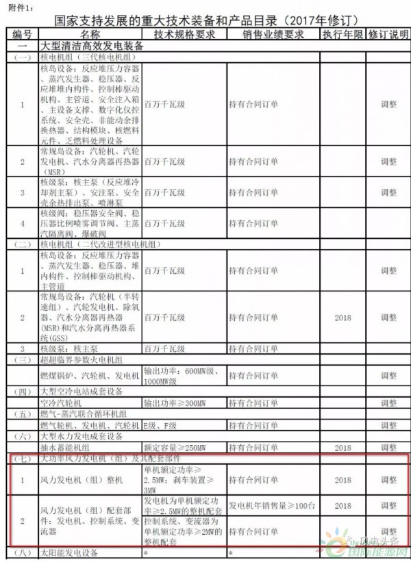 2017年12月底,財(cái)政部會(huì)同發(fā)展改革委、工業(yè)和信息化部、海關(guān)總署、稅務(wù)總局、能源局共同印發(fā)了《關(guān)于調(diào)整重大技術(shù)裝備進(jìn)口稅收政策有關(guān)目錄的通知》。昨天(2018年1月8日),財(cái)政部發(fā)布了六部門印發(fā)《關(guān)于調(diào)整重大技術(shù)裝備進(jìn)口稅收政策有關(guān)目錄的通知》,對(duì)該政策的三份目錄進(jìn)行了調(diào)整。政策附件中涉及對(duì)大功率風(fēng)力發(fā)電機(jī)組及其配套部件的調(diào)整。