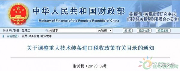2017年12月底,財(cái)政部會(huì)同發(fā)展改革委、工業(yè)和信息化部、海關(guān)總署、稅務(wù)總局、能源局共同印發(fā)了《關(guān)于調(diào)整重大技術(shù)裝備進(jìn)口稅收政策
