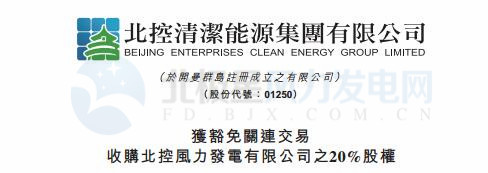 零代價(jià)!北控清潔能源全資附屬公司收購北控風(fēng)力發(fā)電有限公司20%股權(quán)