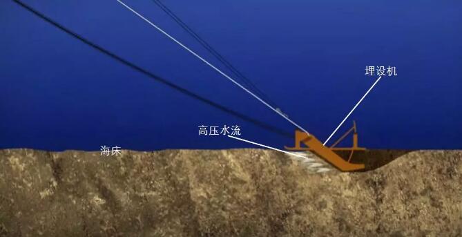 ▲埋設(shè)機(jī)在海床之下的底泥中噴出高壓水流,沖擊出一條壕溝,同時(shí)敷設(shè)海纜。