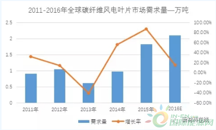 近年來,碳纖維及其復(fù)合材料在風(fēng)電葉片領(lǐng)域的使用越發(fā)的廣泛,風(fēng)電機(jī)組的大型化和海上化都極大的地拉動(dòng)對(duì)碳纖維葉片的需求,下圖為2011年-2016年全球碳纖維風(fēng)電葉片市場(chǎng)需求量。