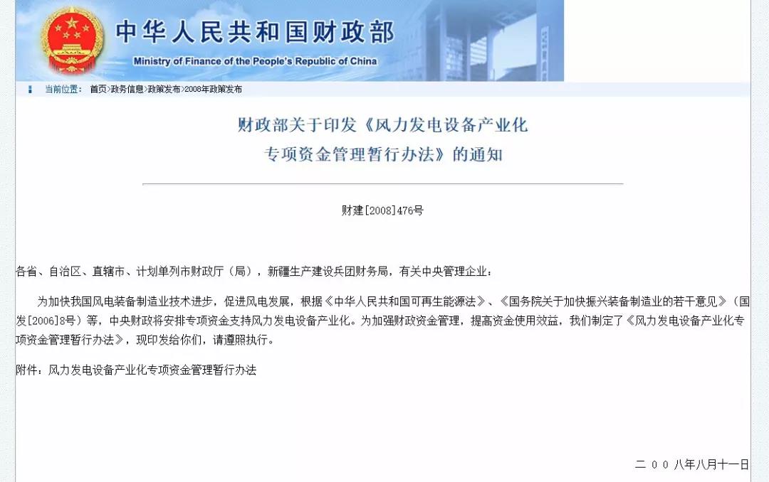 2008年8月,國(guó)家財(cái)政部發(fā)布《風(fēng)力發(fā)電設(shè)備產(chǎn)業(yè)化專項(xiàng)資金管理暫行辦法》(下稱《辦法》),明確了中央財(cái)政安排風(fēng)電設(shè)備產(chǎn)業(yè)化專項(xiàng)資金的補(bǔ)助標(biāo)準(zhǔn)和資金使用范圍,并將對(duì)風(fēng)力發(fā)電設(shè)備制造商給予直接的現(xiàn)金補(bǔ)貼。