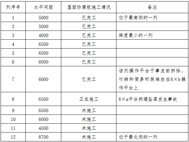 事發(fā)操作平臺位于第8列最西側(cè)部位,其尺寸約6.5m×7.0m。該平臺頂上的屋面防腐板已安裝完畢,第8列以后的屋面防腐板未安裝。