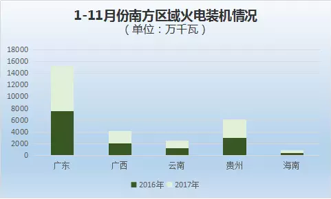 2017年1-11月份南方區(qū)域廣東、貴州、廣西火電裝機(jī)容量分別為7710萬千瓦、3089萬千瓦、2159萬千瓦,比上年同期增長1.7%、2.5%、5.9%。云南、海南火電裝機(jī)容量基本與上年同期持平。2017年南方區(qū)域的火電冗余現(xiàn)象明顯,直接影響了該區(qū)域火電裝機(jī)容量的增長。